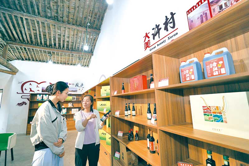 在许村游客接待中心,工作人员正在为游客介绍和顺特产。