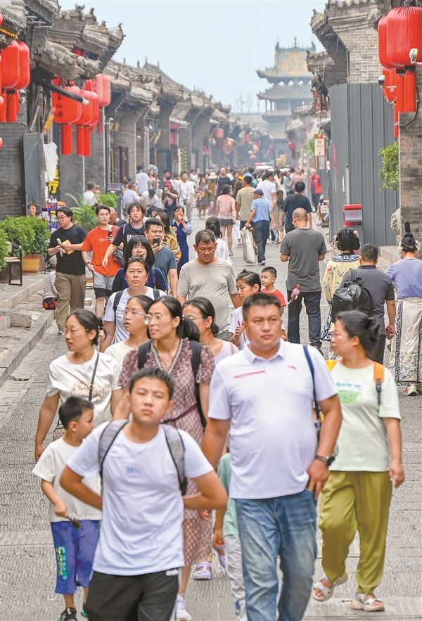 7月8日,游客在平遥古城游览观光。暑假以来,平遥古城迎来旅游旺季,游客们游览古城,感悟历史文化,品味当地美食,穿古装打卡留念,乐享暑假快乐时光。