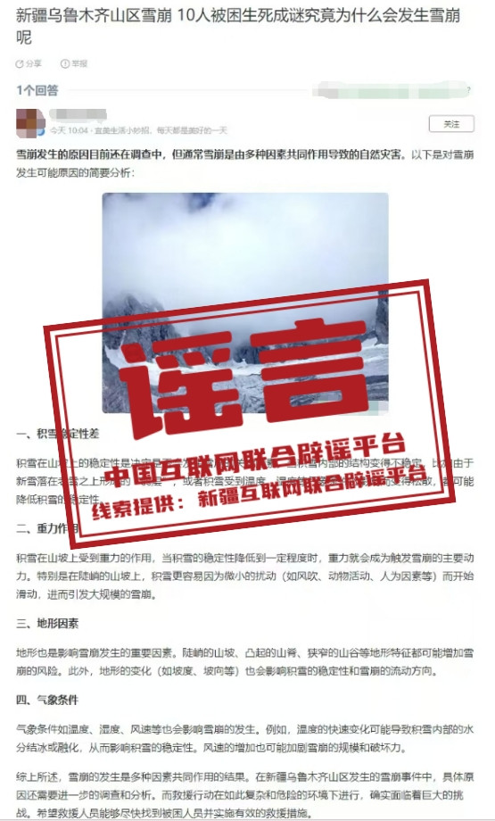 谣 言 乌鲁木齐山区发生雪崩,10人被困生死成谜?