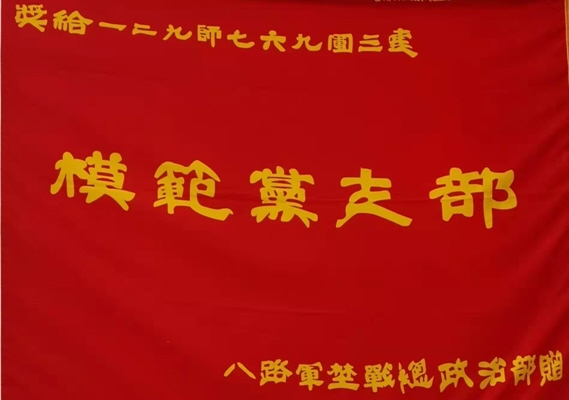 “模范党支部”战旗属于从长征中走来、在战火中诞生的红三连。上海雕塑院原党支部副书记、太行人民抗战研究院特聘研究员王欣介绍,三连前身是中国工农革命军鄂东军一部,1927年11月14日,参加黄麻起义后,三连随大部队与敌展开艰苦卓绝的斗争,参加了双桥镇、苏家埠等著名战役战斗。鄂豫皖革命根据地第四次反“围剿”失败后,三连随红四方面军转战川陕根据地。1934年10月开始长征,强渡大金川、三过雪山草地,于1936年10月与红一、二方面军在甘肃会宁胜利会师。1935年7月,三连被红四方面军授予“支部是连队堡垒”荣誉称号。1941年11月,被八路军总部野战政治部授予“模范党支部”战旗。