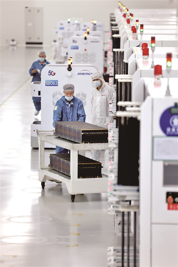 9月15日,在晋能光伏技术有限责任公司TOPCon智能制造车间,全自动智能流水线高速运转,沿着地面隐形轨道、灵活穿梭的AGV机器人忙碌地供料、转运,机械臂灵活地将物料从小车上抬起并放入相应的生产线,整个过程一气呵成。电池片经过一系列自动化加工工序变成一块块的光伏组件,每个工段仅配一名工人处理异常以及辅助产线抽检工作,其余的步骤几乎都是由机器人操作。