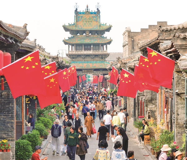 9月28日,国庆中秋“双节”临近,平遥古城挂满了鲜艳的五星红旗,与古建筑交相辉映,营造出浓厚的节日氛围,点燃了游客与市民心中炽热的爱国情怀。