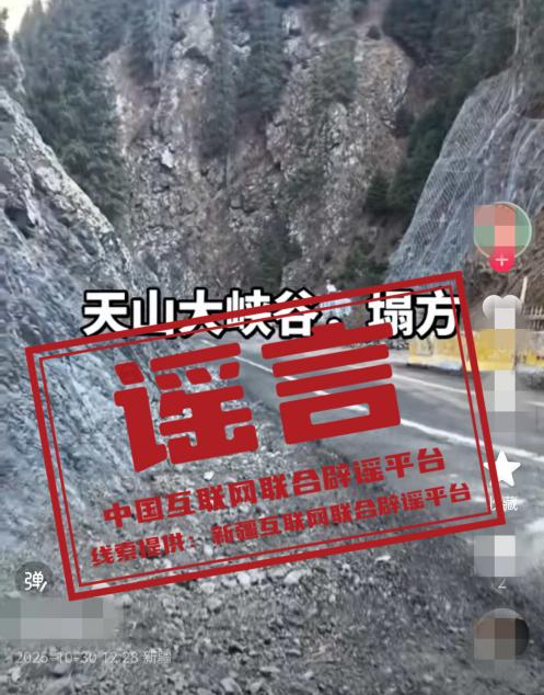 真相:近日,有网民在网络平台发布视频并配文称“天山大峡谷塌方”,引发关注。经乌鲁木齐市南山景区管理委员会核实,该情况不属实,相关信息系谣言。网传图片实为2025年10月24日,乌鲁木齐中佳勘察设计有限公司在天山大峡谷景区进入山沟1.3公里处进行山体排险作业时的画面。(来源:“新疆网络辟谣”微信公众号)