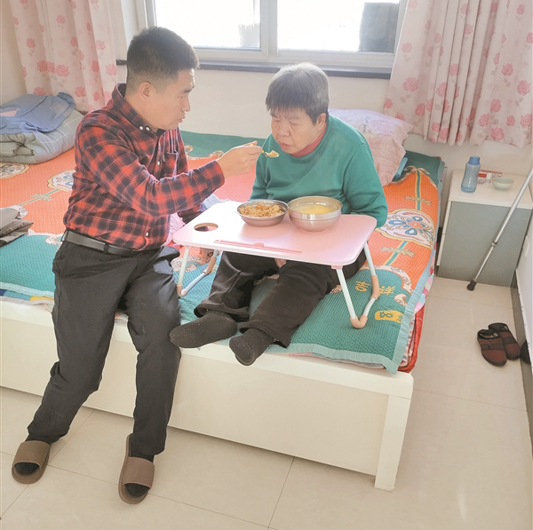 十年间,他的生活作息完全围着母亲的需求转:清晨起床先喂药、洗漱,再做易消化的早餐慢慢喂食。中午下班后火速赶回家,收拾家务、帮母亲翻身按摩。晚上睡前擦洗身体、整理被褥,陪着老人唠家常。每周剪指甲、每月理发……这些细致活儿,他都记在心里,从未推脱过一次。即使工作繁忙劳累,面对病痛中的母亲,他始终温和耐心,从不在老人面前露出半点疲惫,只说道:“妈当年拉扯我们不容易,这点付出不算什么。”