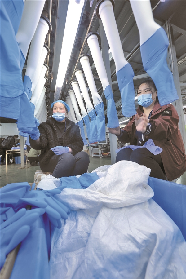左权县乳胶产业园星荣科技有限公司年产60亿只丁腈手套项目,计划总投资9亿元,占地123亩,分三年三期实施。目前,项目一期8条单线建设完成,其中4条已开始试运行。待项目全部建成投产后,年可生产丁腈手套60亿只,年销售收入15亿元,税收 8000万元,并可新增就业岗位1200个。图为该企业生产现场。