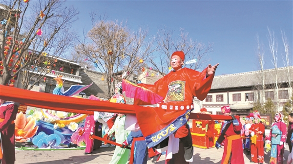 非遗、年货、文创集市上,剪纸、皮影、泥塑、堆绣、木版年画等传承人现场创作,推动非遗文化活态传承;舞狮、抬阁、秧歌、传统器乐等社火表演,全面展示地方年俗和时代风尚;大学生快闪直播,用青春视角记录年味中的家乡美;古城灯光秀通过3D光影技术呈现视觉盛宴;焰火集中表演展现流光溢彩的壮丽图景,营造浓郁喜庆氛围。