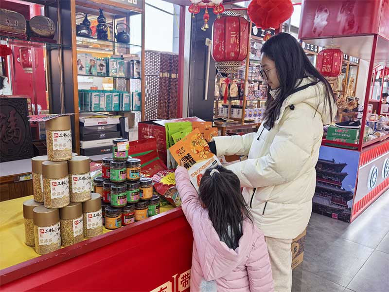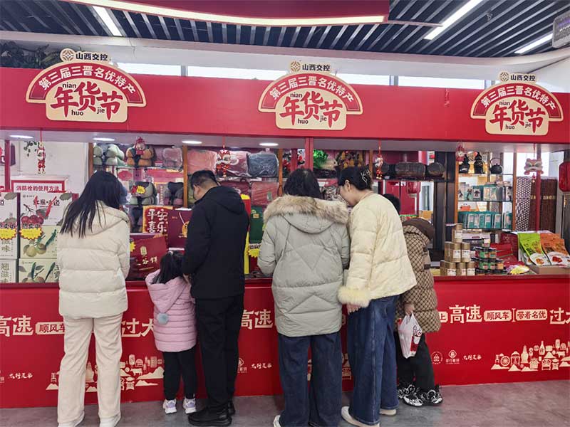 年货节展台上,三晋风味与盂县本土好物齐聚一堂,构成最地道的年味清单。平遥牛肉纹理紧实、酱香浓郁,切开即食的便捷让赶路的人随时能尝到山西味道;老陈醋醇香绵酸,瓶装礼盒轻便易携,成为不少旅客必带的伴手礼;娘子关非遗压饼整齐摆放,薄似蝉翼、色泽金黄,一口下去满是水磨粗粮的醇香与花椒叶的鲜爽;还有现做的冰糖葫芦、热气腾腾的地方小吃,甜香与肉香交织,勾得大人小孩纷纷驻足品尝。往来旅客,在摊位前穿梭,把地道晋味装进行囊。