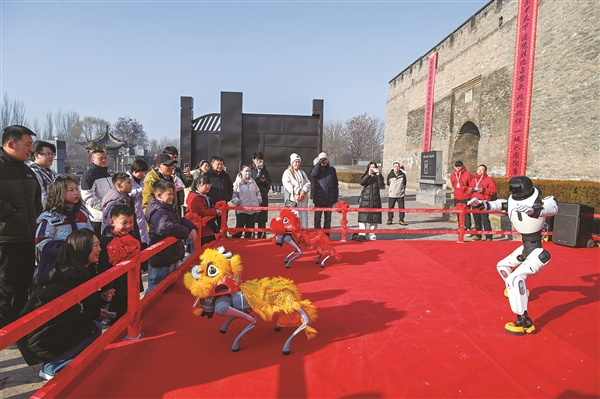 平遥古城的城墙下,年味伴着科技感扑面而来。身着喜庆年服的机器狗与机器人齐登场,机器狗变身“醒狮”,摇头摆尾,鬃毛随动作轻轻颤动,仿真的神态灵动鲜活;机器人身姿矫健,与机器狗默契配合,既有传统舞狮的豪迈气势,又有科技赋能的时尚灵动。往来游客纷纷驻足,拿出手机记录这一幕,孩童则围着它们蹦蹦跳跳,欢呼声、快门声交织在一起,把新春的欢喜烘托得愈发浓烈。