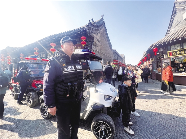 春节期间,平遥县公安局古城派出所民警坚守一线,维护古城旅游秩序。